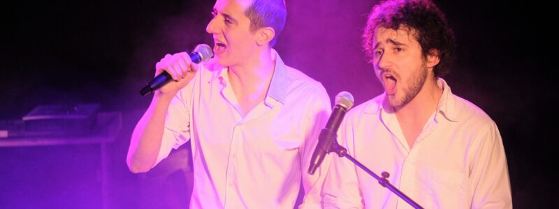 Bienvenue dans un cabaret décalé, qui oscille entre le charme rétro des shows télévisés américains des années 80 et l’énergie effervescente d’une série de stand-up moderne. Bastien Blanchard et Antoine Courvoisier forment un duo complice et parfaitement rodé, enchaînant avec brio imitations d’acteurs, de chanteurs et chanteuses célèbres, le tout saupoudré d’humour et de bonne dose d’autodérision.